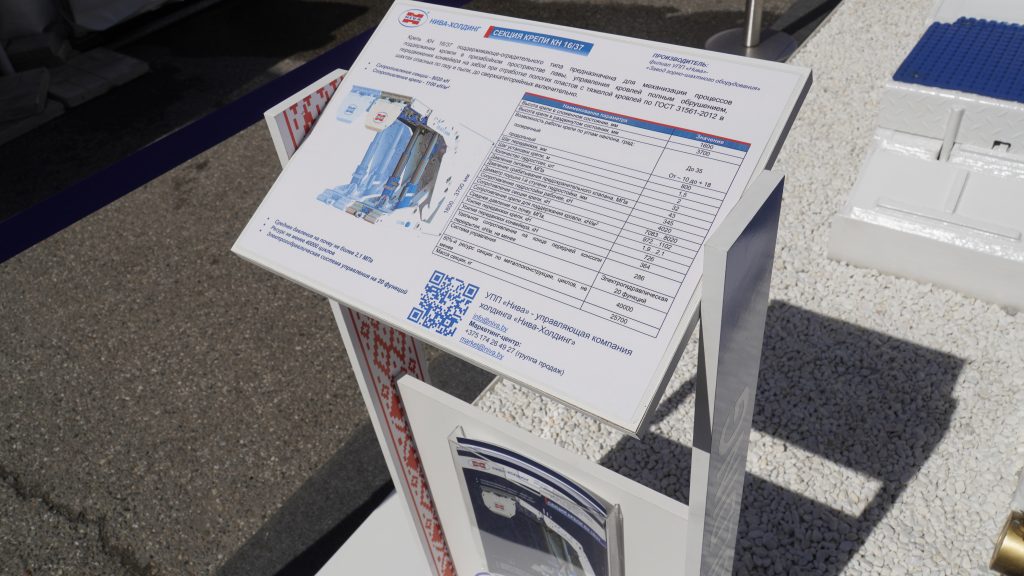 Один из лидеров белорусского горного машиностроения Холдинг «Нива-Холдинг» активно участвует в выставке на протяжении многих лет. В 2022 году бренд «NIVA» представил секцию крепи для угольных шахт КН 16/37 производства филиала УПП «Нива» — «Завод горно-шахтного оборудования».